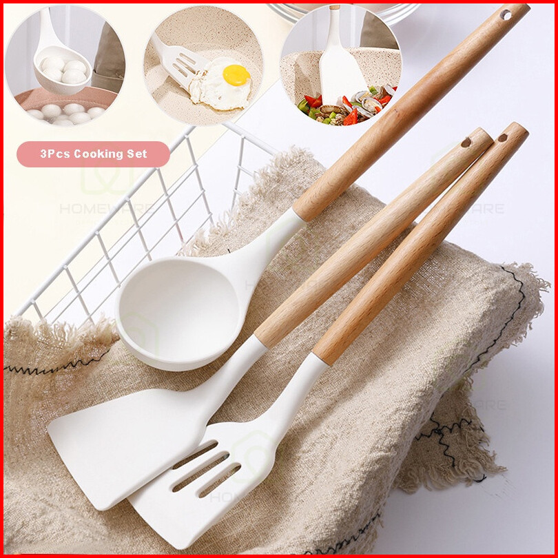 Home Ware 3pcs Set Wadah Spatula Spatula Set Silikon Tahan Panas Pegangan Kayu Baking Set Alat Masak Spatula Silicone Si