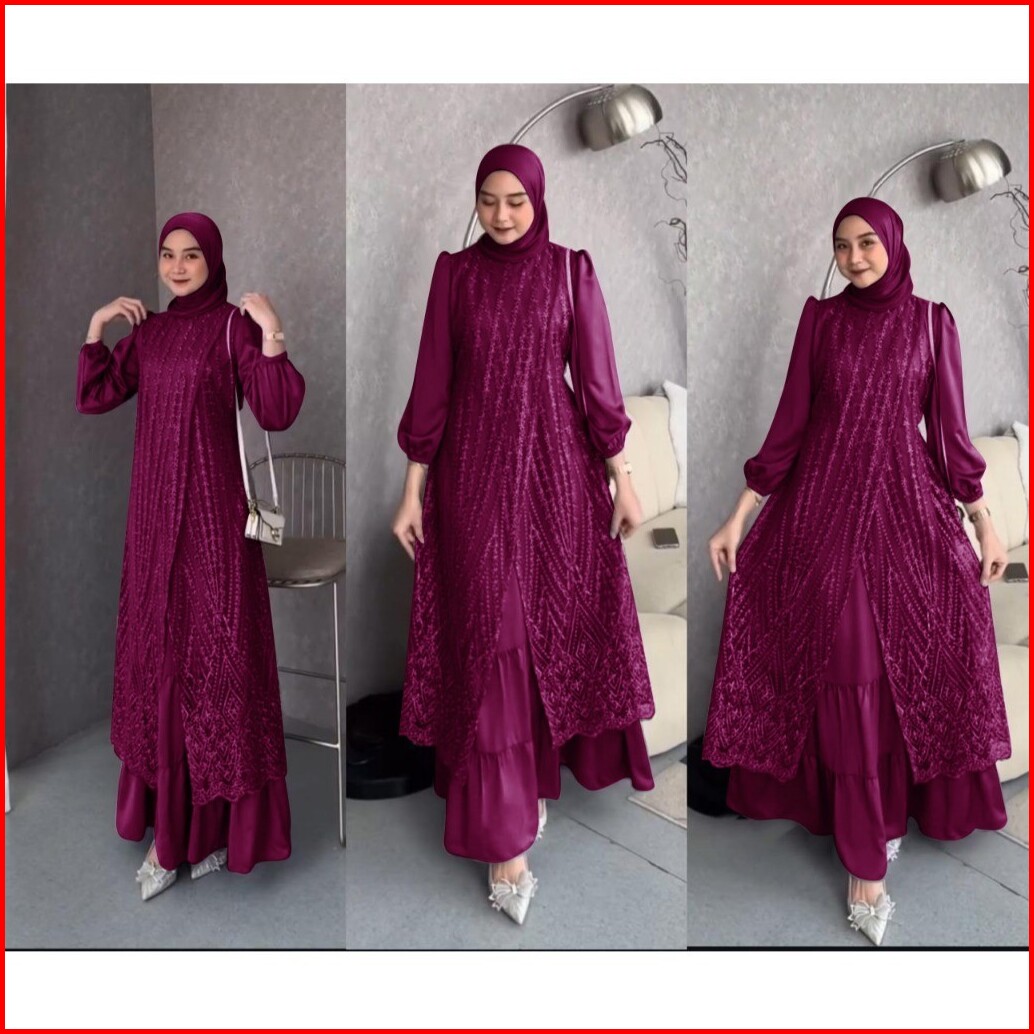 Fuji Dress Pesta Brukat Tille Premium Lebaran Gamis Pesta Mewah Bahan Maxmara Mix Brokat Timbul