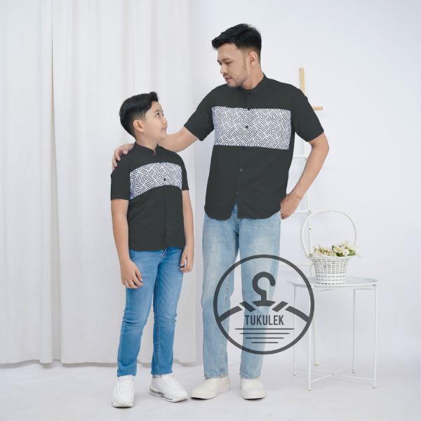 Baju Koko Lengan Pendek Couple Motif Kombinasi Batik Warna Hitam Couple Ayah Dan Anak Premium Warna Hitam