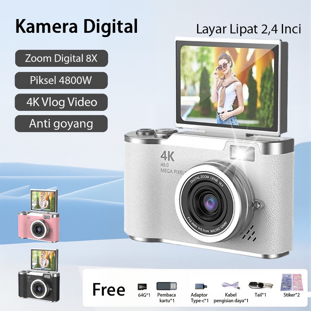 Kamera Digital 48MP 8X Zoom Kamera Digicam Layar Balik 180° LCD 2,4 Inci 4K Vlog Anti Goyang Filter Kamera Pocket untuk