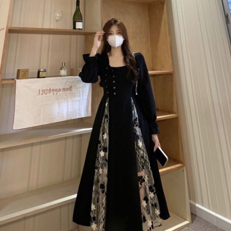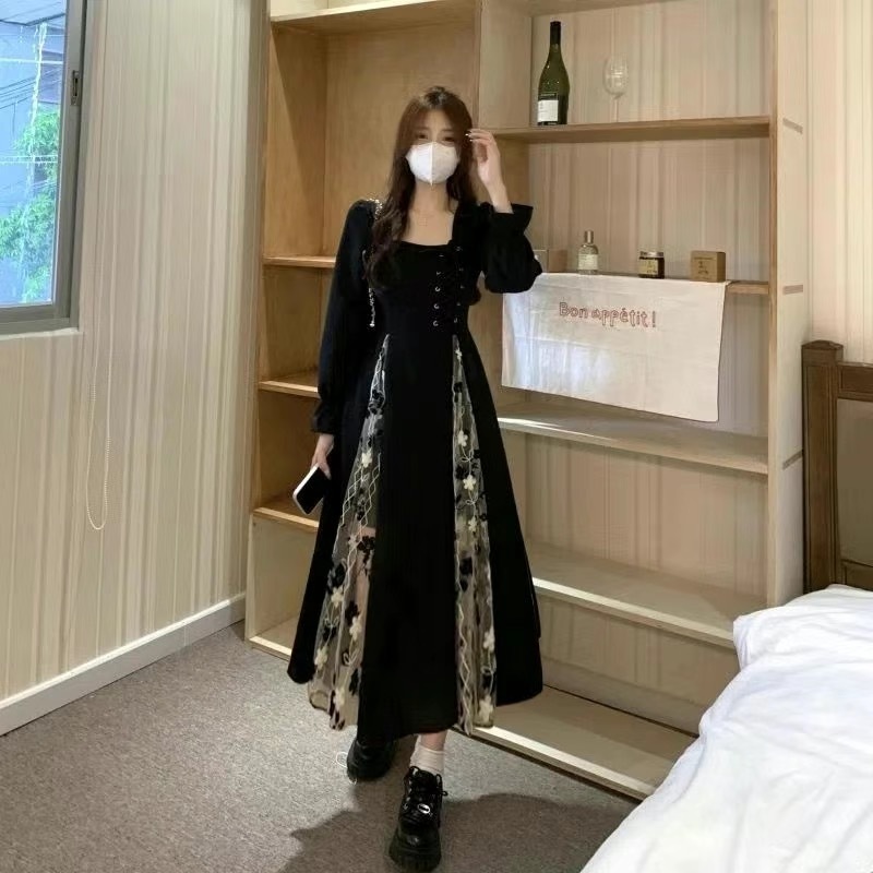 Pakaian Wanita Long Dress Retro Elegant Squer Neck French Black Dress Baju Dress Wanita Terbaru G039