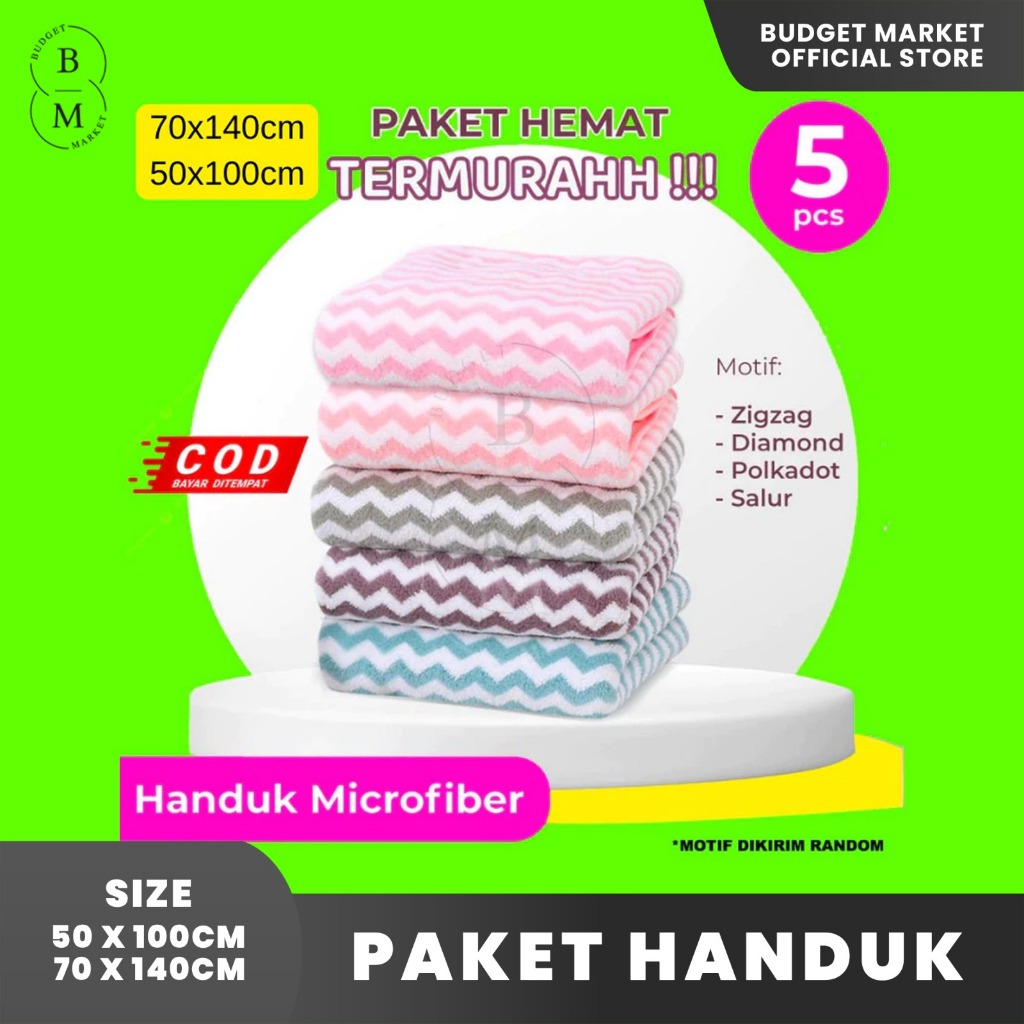 Paket 5 Pcs Handuk Mandi Microfiber 70x140 cm dan 50x100 cm Halus Lembut Termurah