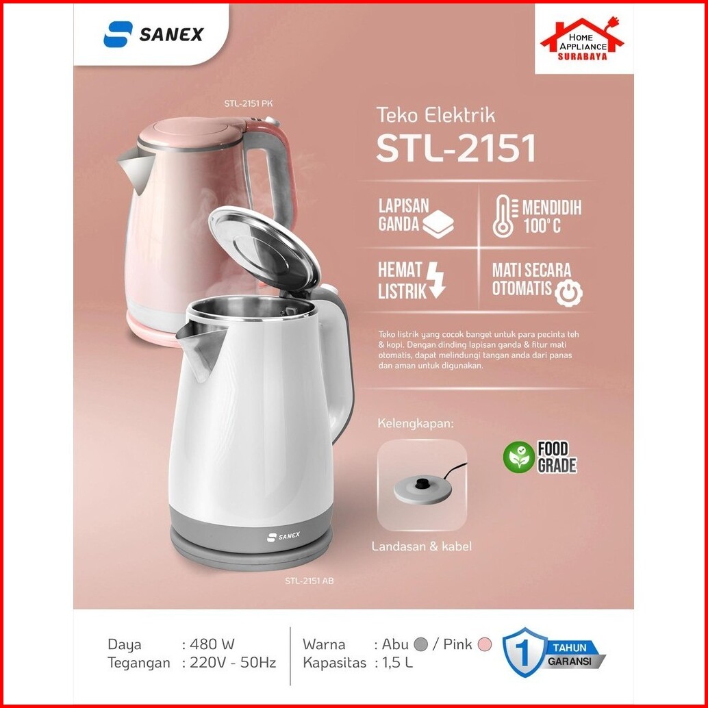 Sanex Electric Kettle 1.5l - Teko Listrik Stainless Steel 1.5 Liter Stl-2151 Pk Ab Ht - Stl2151