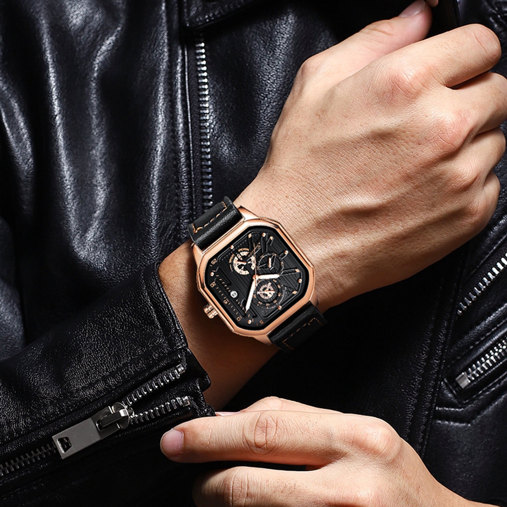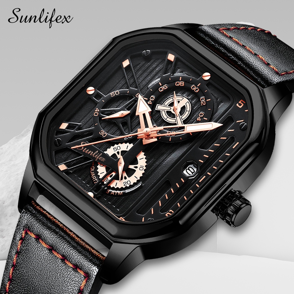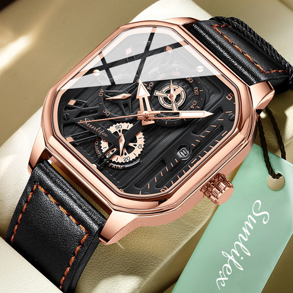 Jam Tangan Pria Hitam Dial Kotak Tali Kulit Fashion Anti Air – Sunlifex 9095
