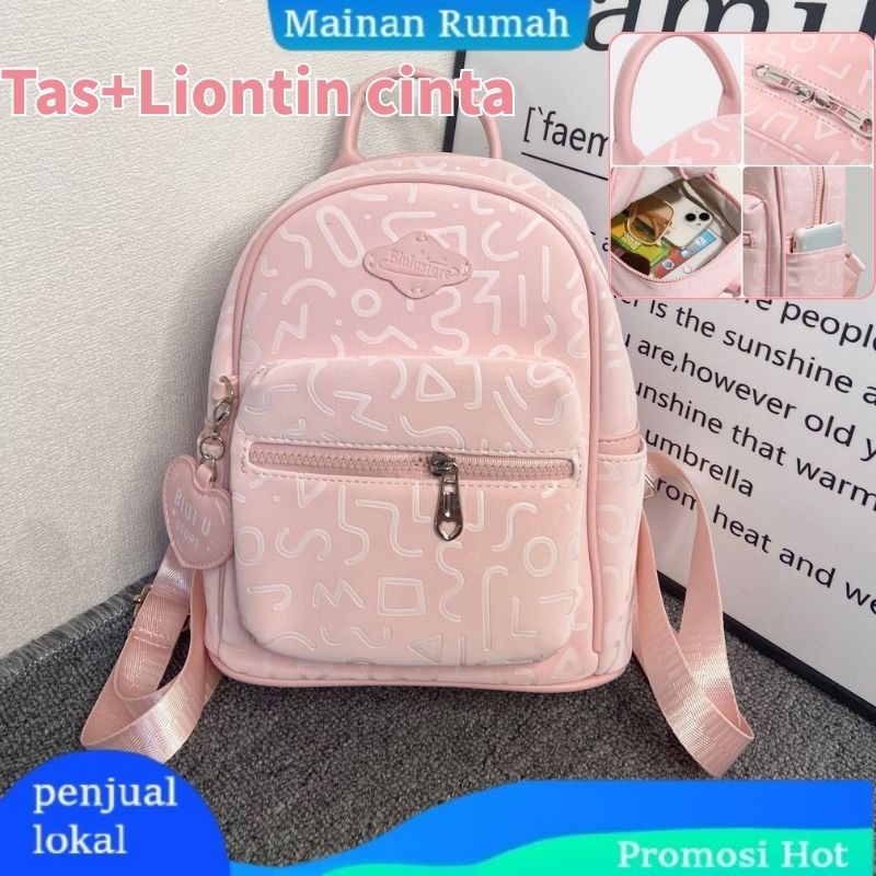 Tas Ransel Mini Kulit Sintetis Wanita Pink Bonus Liontin Cinta Korean Trend
