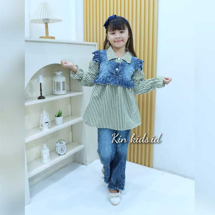 Setelan Anak Perempuan Salur Kemeja dan Celana Jeans Cutbray Usia 3–9 Tahun Kin Kids