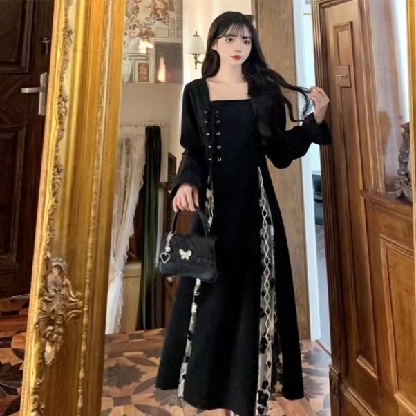 Baju Gaun Retro Renda Bunga Hitam Squer Neck Dress Maxi Long Dress G039