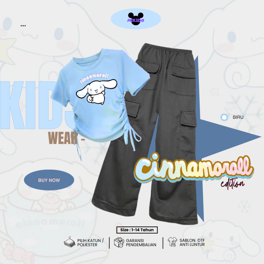 Setelan Crop Top Serut dan Celana Kargo Anak Perempuan Motif Karakter Sanrio