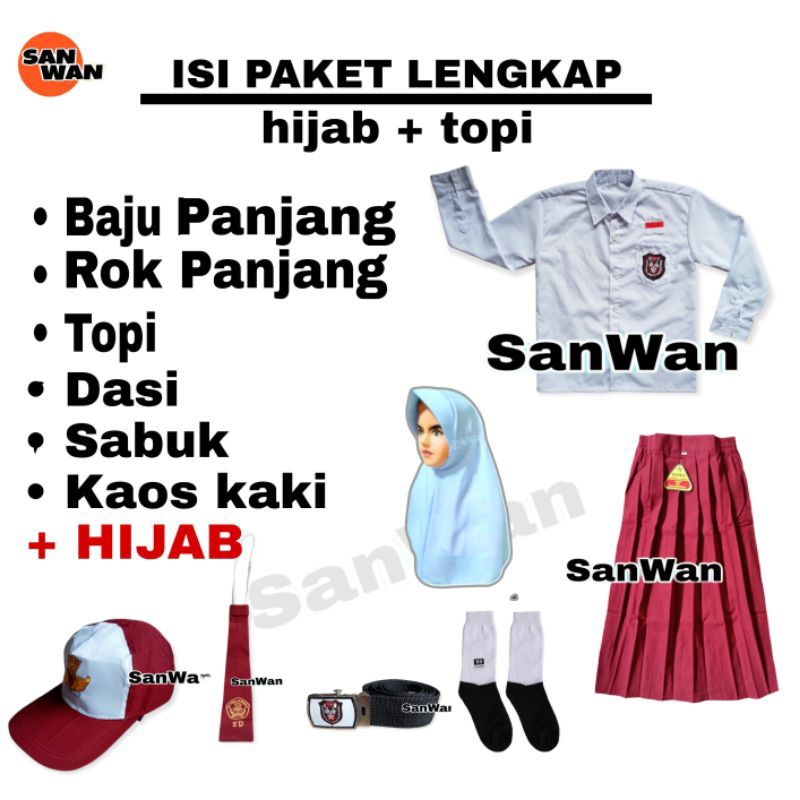 Setelan Seragam Sekolah SD Anak Perempuan Merah Putih Baju Rok Panjang Plus Hijab