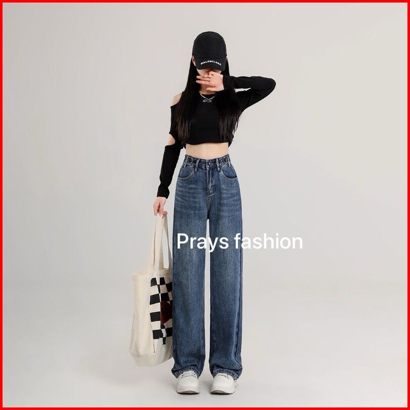 Prays Fashion - Biru Laut Highwaist Kulot Jeans Wanita Korean Jeans Wanita Loose Pinggang Dapat Disesuaikan Adjustable