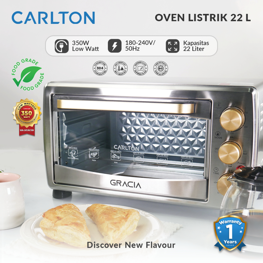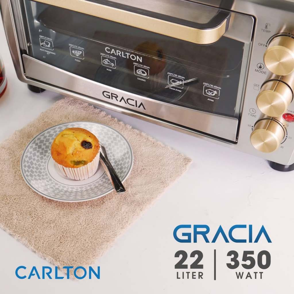 CARLTON Oven Listrik GRACIA 22 Liter Low Watt Pemanas Atas Bawah Stainles Steel Pemanggang Kue