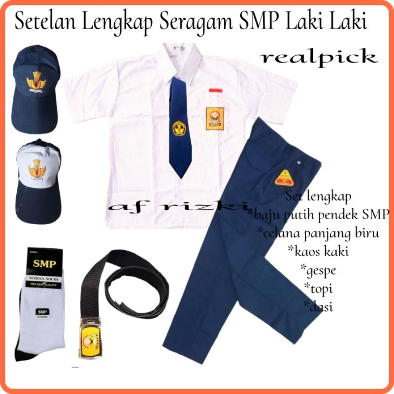 Setelan Seragam Sekolah SMP Biru Putih Anak Laki Laki Baju Pendek Celana Panjang Set Lengkap