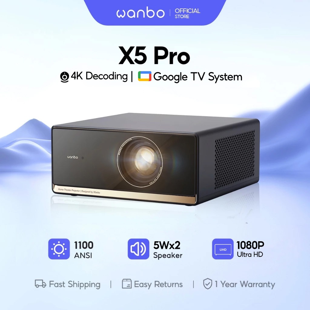 Wanbo X5 Pro Proyektor Google TV FHD 1080P 2x5W HiFi Stereo Speakers 1100 ANSI Lumens Smart Projector