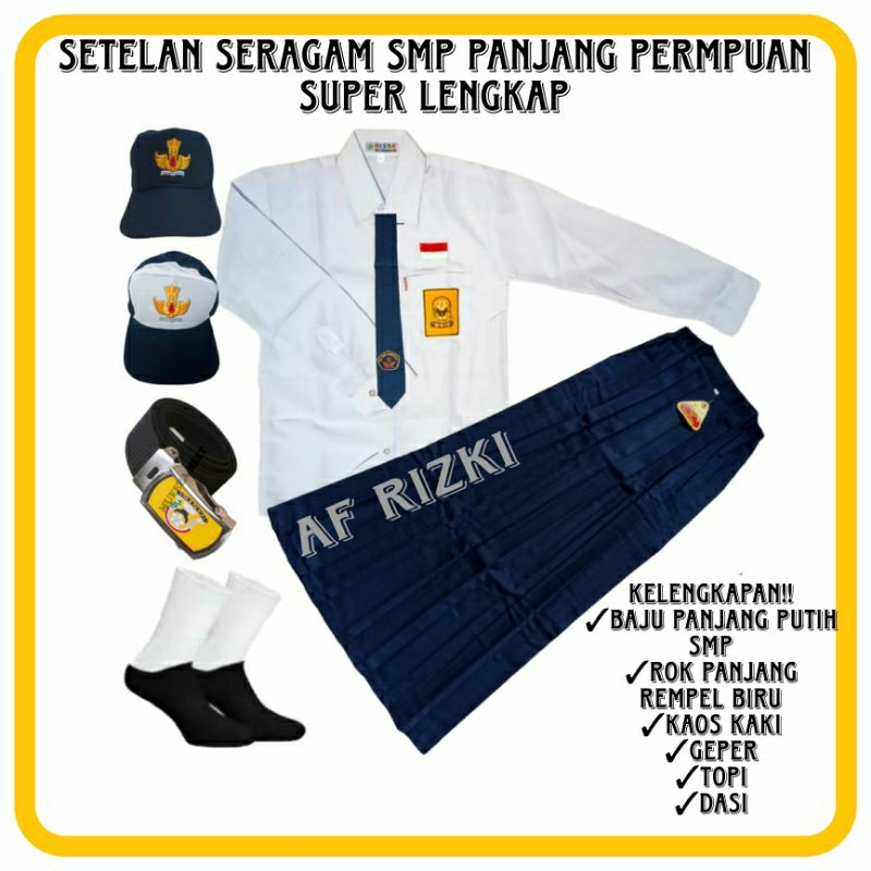 Setelan Seragam Sekolah SMP Biru Putih Anak Perempuan Baju Putih Lengan Panjang Super Lengkap