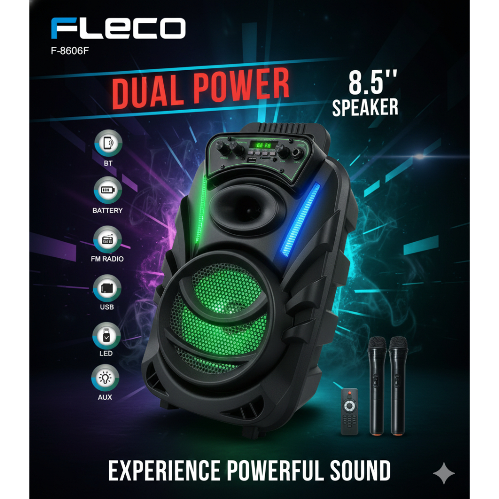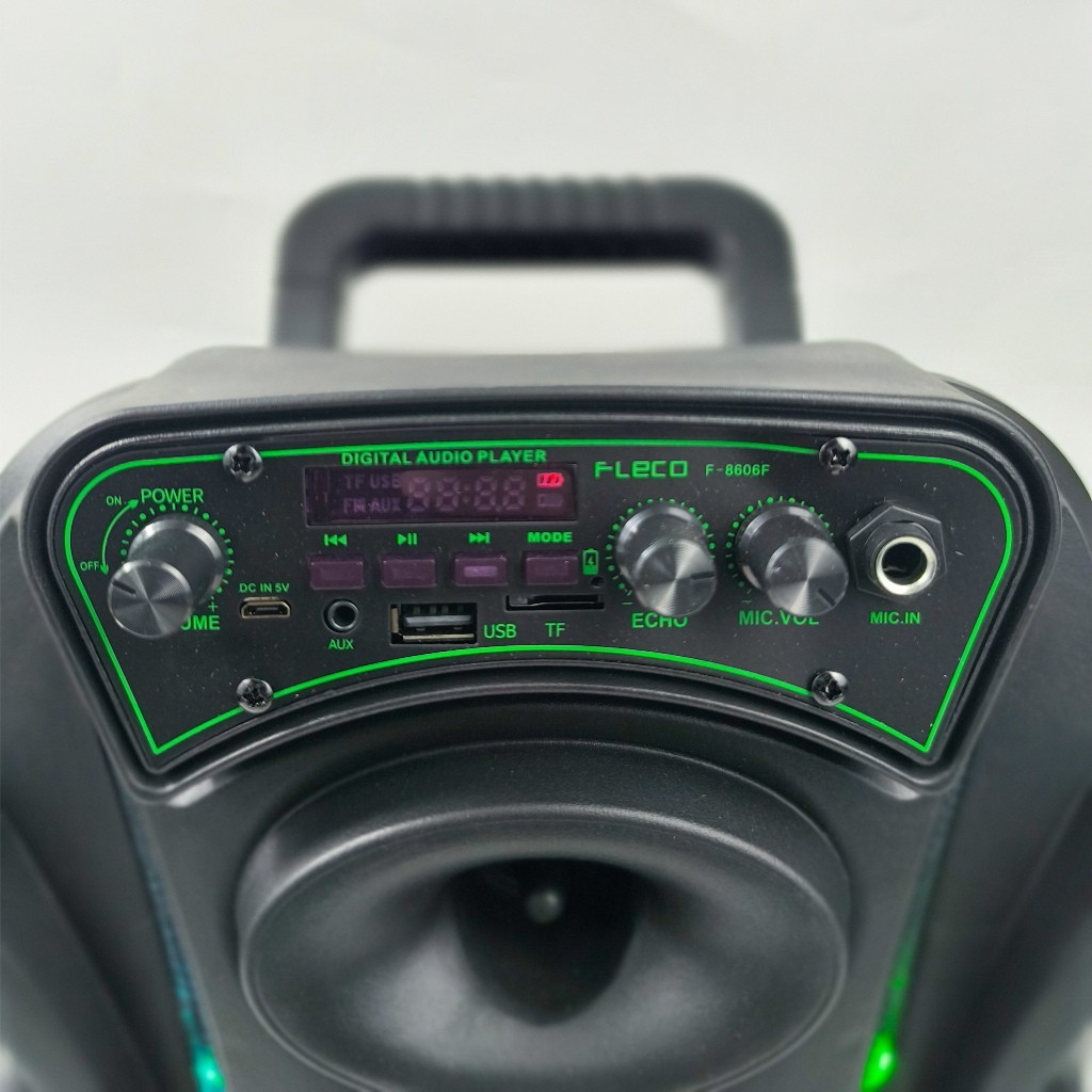Speaker Portable Bluetooth 8.5 inch Dual Power Fleco F-8606F LED DIsplay Mode FM BT AUX TF Card Free 2 Mic Wireless dan