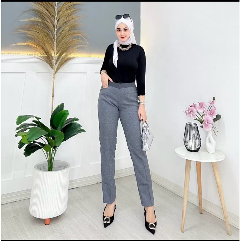 celana kerja WANITA JUMBO PINGGANG KARET kain wol impor premium HIGHWAIST