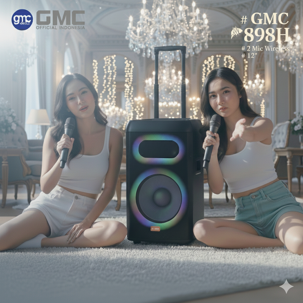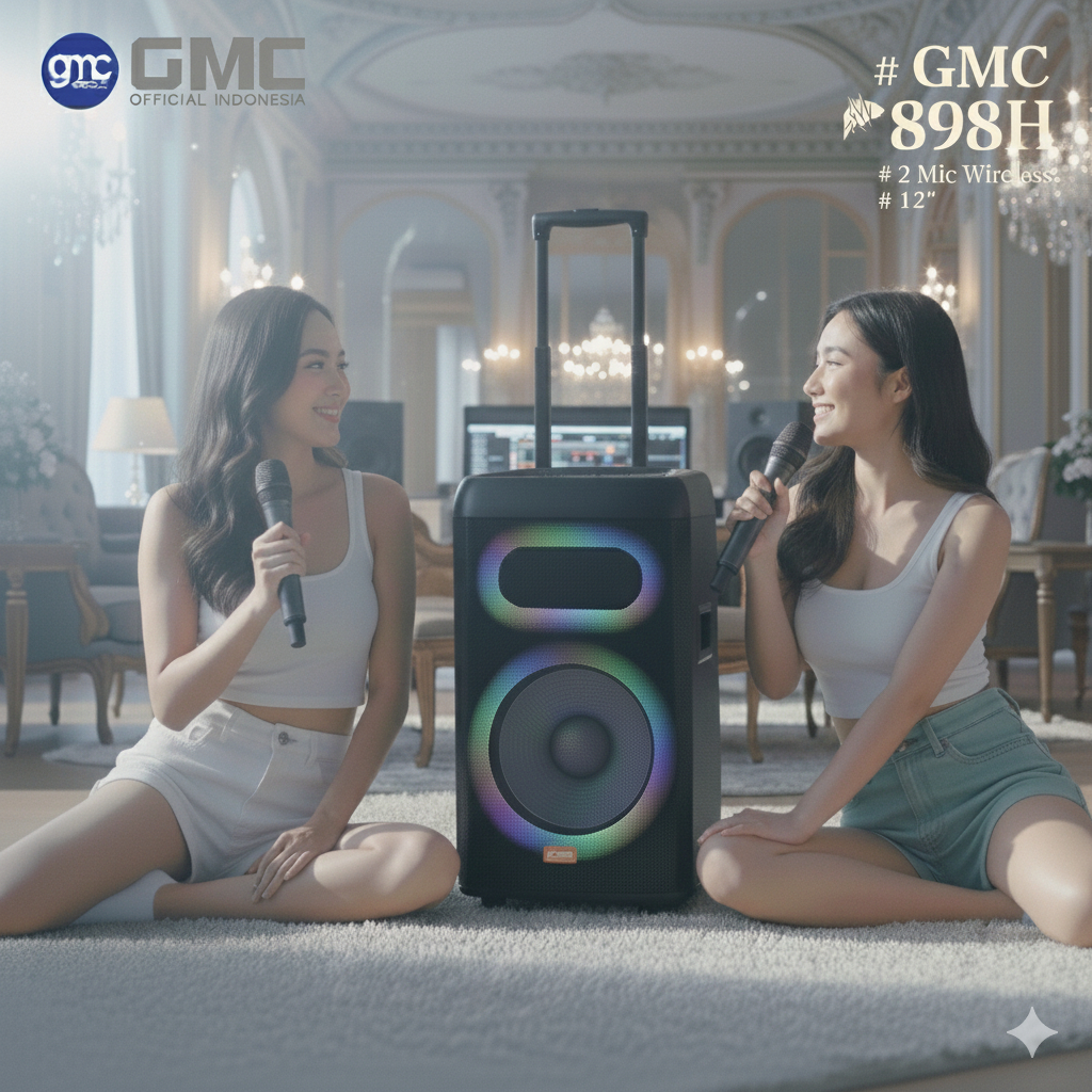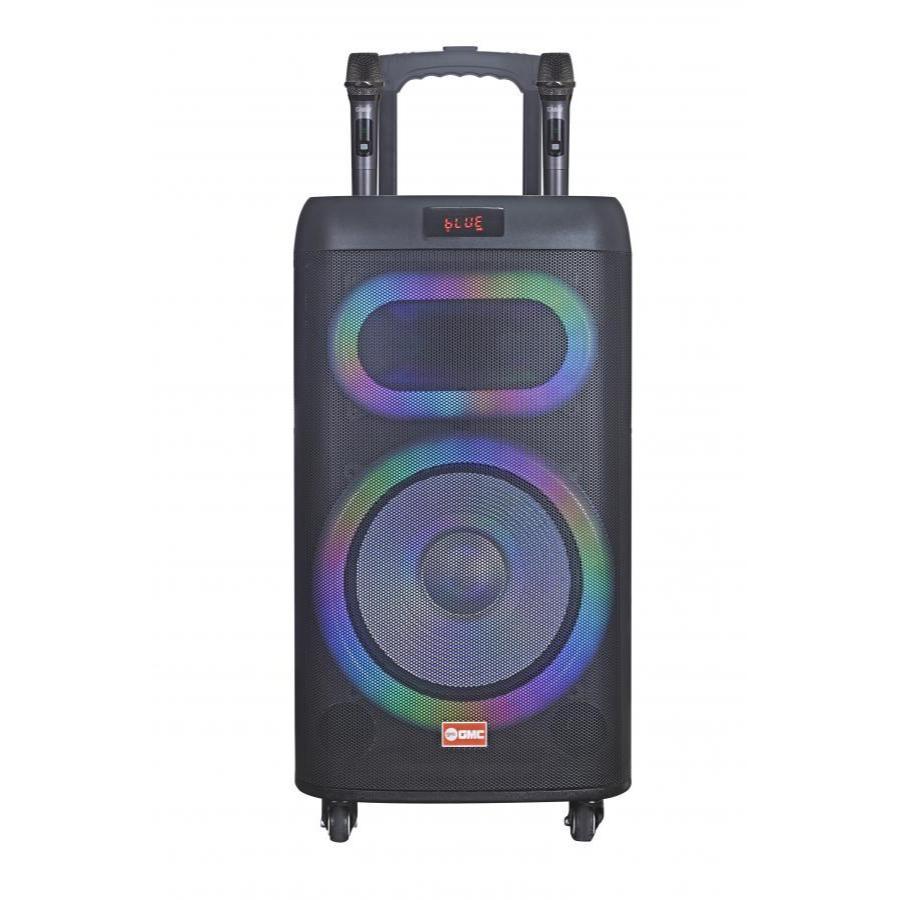 Speaker Trolley Portable GMC 898H – Bluetooth Karaoke Speaker 12" – 250W, USB, AUX, Guitar, Dual UHF Mic, LED RGB Light
