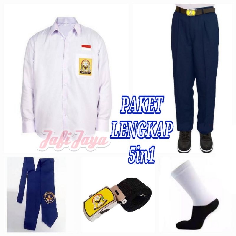 Setelan Seragam Sekolah SMP Biru Putih Laki Laki Baju Putih Lengan Panjang Celana Biru Panjang