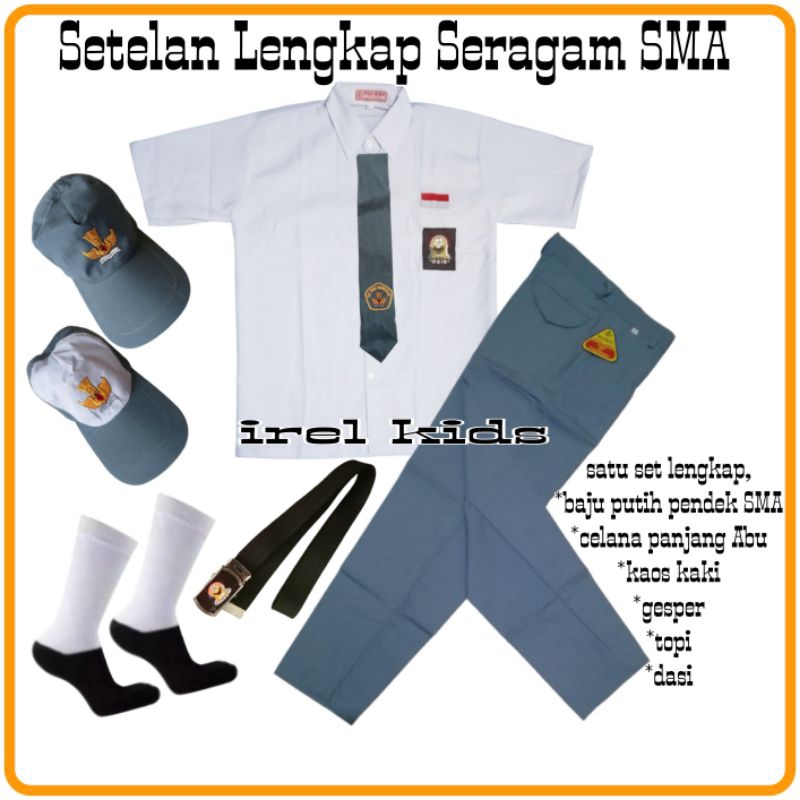 Setelan Seragam Sekolah SMA Putih Abu Laki Laki Baju Putih Lengan Pendek Celana Abu Super Lengkap