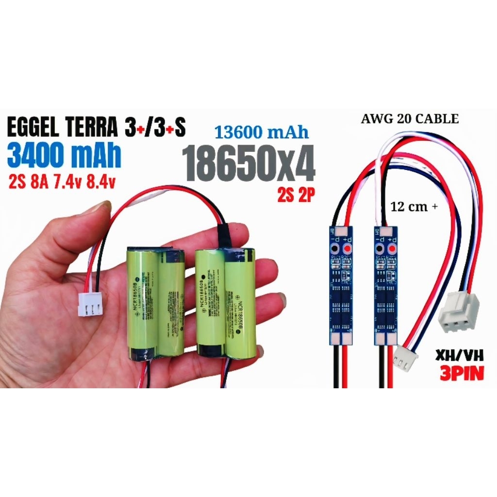 Battery EGGEL Terra 3+/3+S 7.4V 8.4V 13600 mAh UPGRADE 18650x4 BMS 2S 3A 8A XH MOLEX 3PIN
