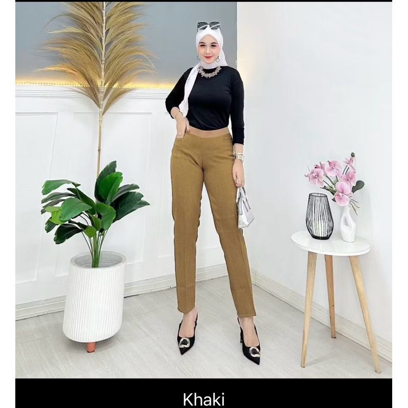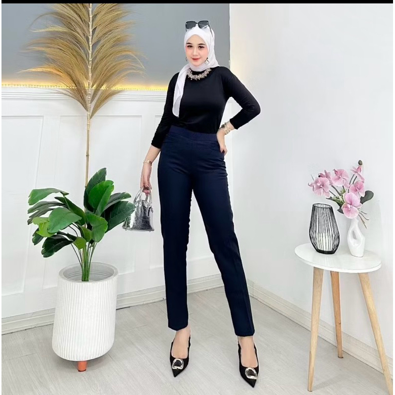 celana kerja WANITA JUMBO PINGGANG KARET kain wol impor premium HIGHWAIST