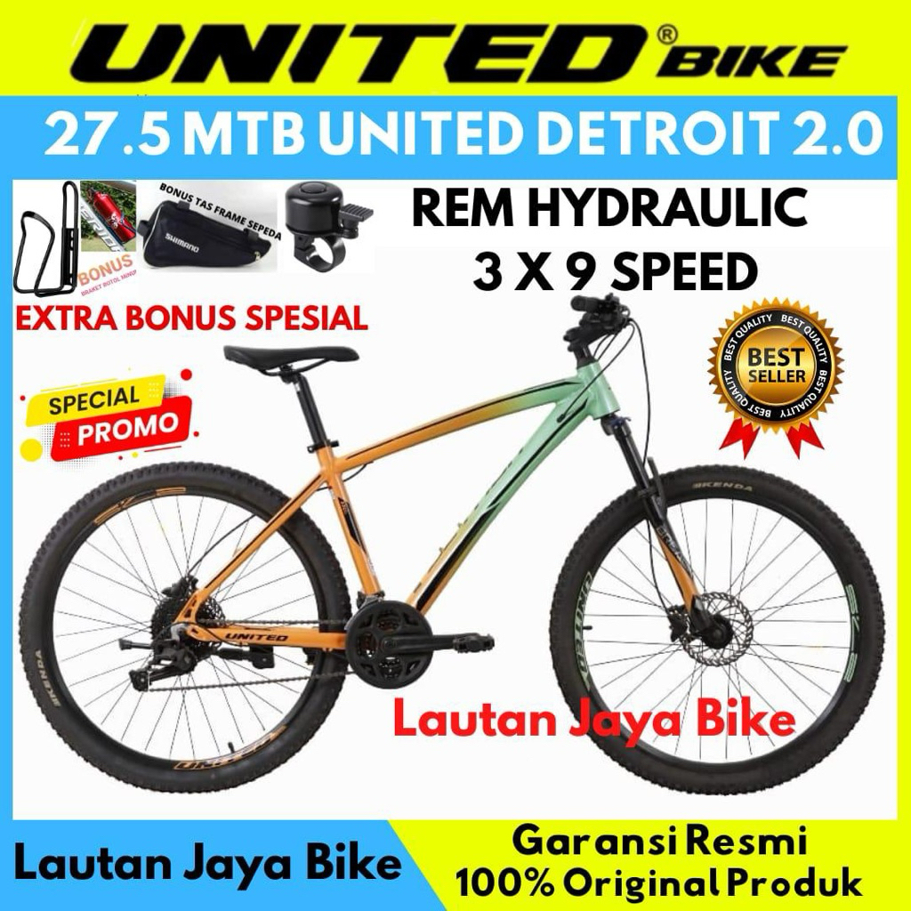 Sepeda Gunung 27.5 MTB UNITED DETROIT 2.0/2.1 Frame Alumunium 3x9 Speed Rem Hidrolik Terbaru