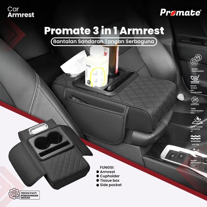 Armrest Mobil 3 in 1 PROMATE Universal Storage Box Cup Holder Tempat Tisu Car Custom Bahan Kulit - Black Fire