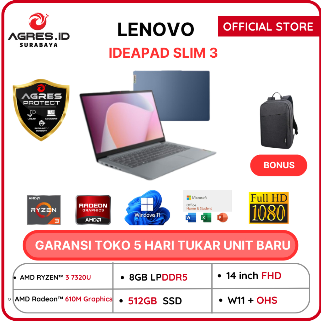 LENOVO IDEAPAD SLIM 3 14 Ryzen 3 7320 8GB 512GB 14.0 FHD Backlit Windows 11+Office