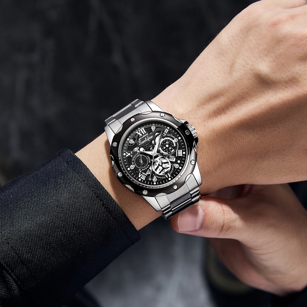 Sunlifex Jam Tangan Pria Kuarsa Luminous Tanggal Kasual Tali Stainless Steel Jam Tangan Cowok 8080
