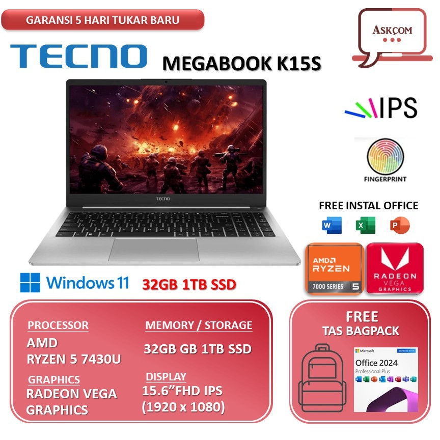Laptop TECNO MEGABOOK K15S AMD RYZEN 5 7430U 32GB 1TB SSD 15.6WUXGA IPS Windows 11+Office SILVER