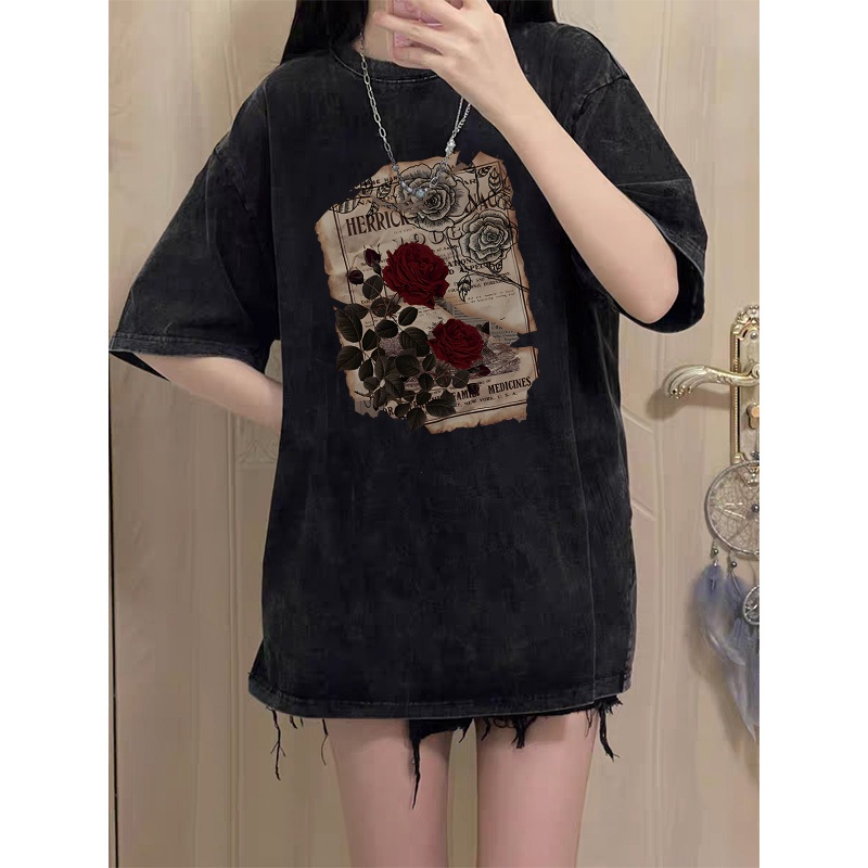 Kaos Oversize Wanita Retro Roses Katun Murni Lengan Pendek – Po Floret
