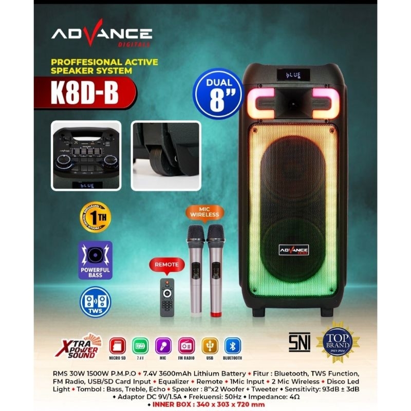 ADVANCE SPEAKER PORTABLE DOUBLE 8 INCH K8D-B BONUS 2 MIC