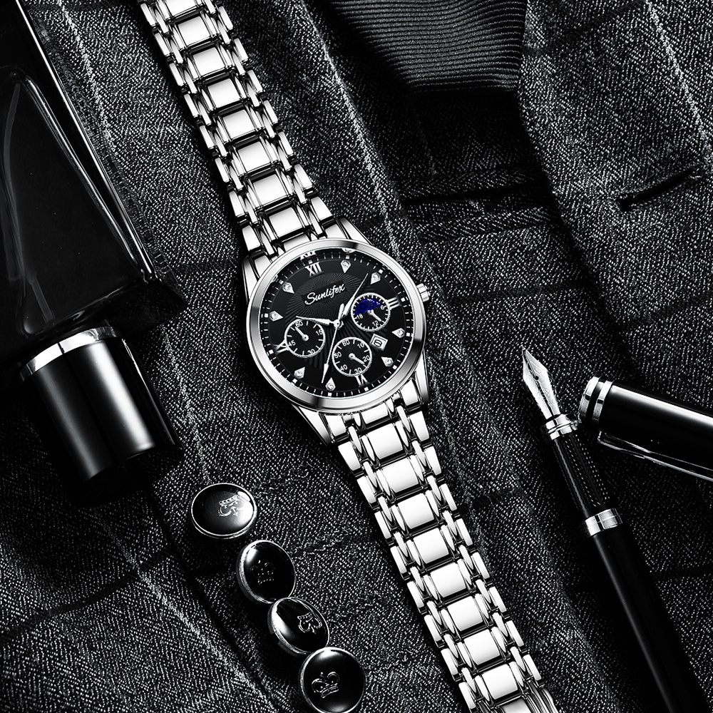 Sunlifex Jam Tangan Pria Original 9004A Kuarsa Calendar Tali Stainless Steel Mode Santai Jam Tangan Cowok