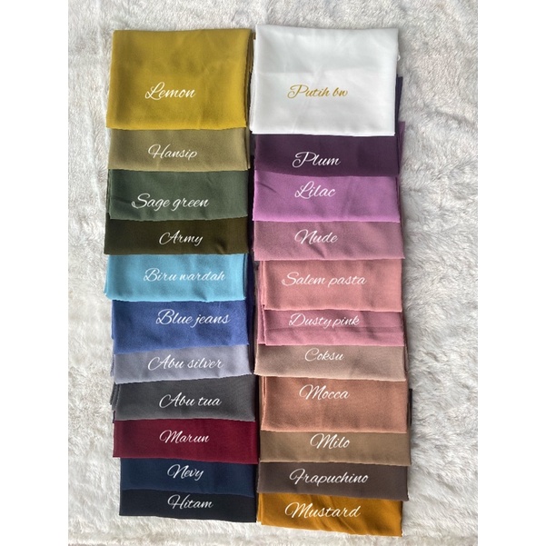 Hitam, Putih bw, salem, Coksu, Moca, Marun, Dusty, Abu Tua, Lilac, Hijau Botol