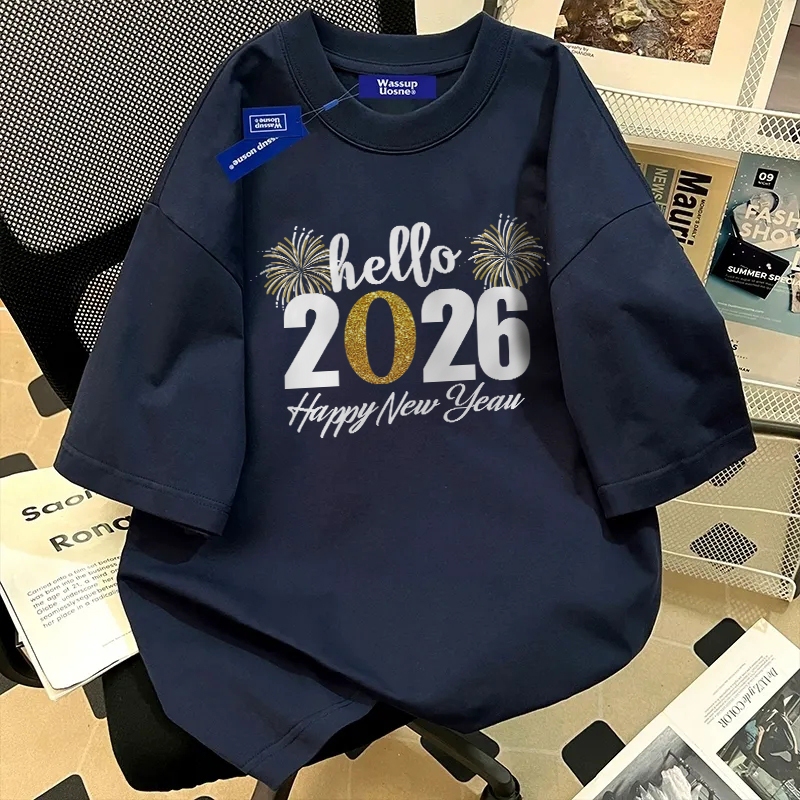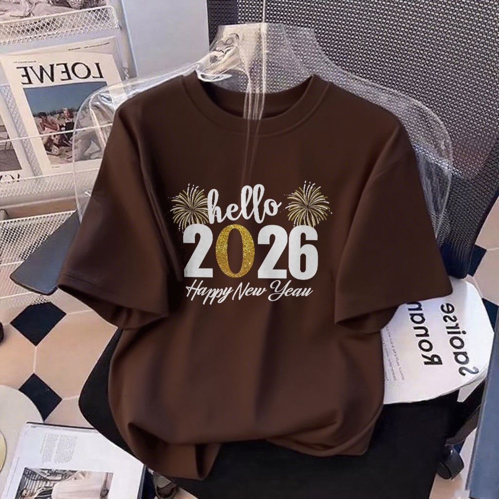 XZHAINV T-shirt Oversize Wanita Bahan Katun Adem Pola Cetak Tahun Baru 2026/Kaos Lengan Pendek Kekinian Warna Solid/Baju