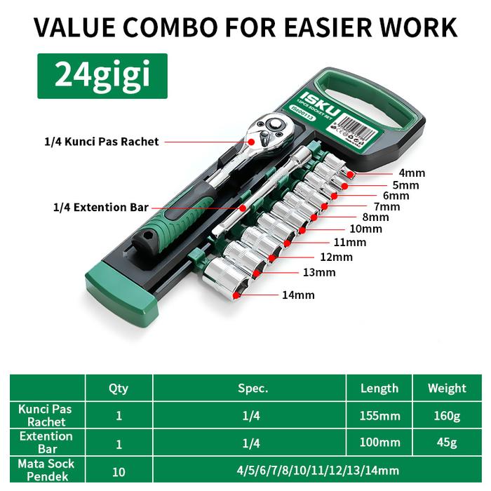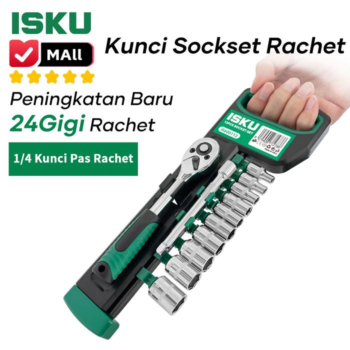 Isku Kunci Socket Set 12Pcs 1/4 Inch Ratchet 4-14Mm Chrome Vanadium Steel Kunci Sok Set 10 Pcs Mata Sok 4-14Mm