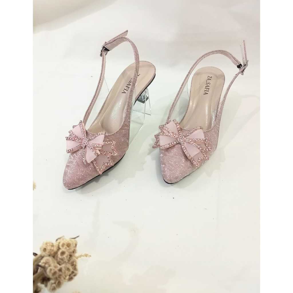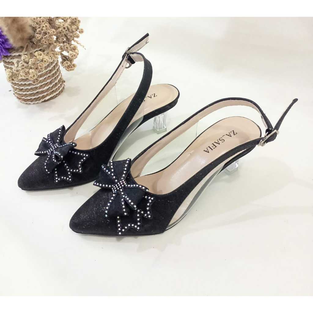 Sepatu Heels Hak Kaca Wanita 5 Cm Slingback Glitter Pita