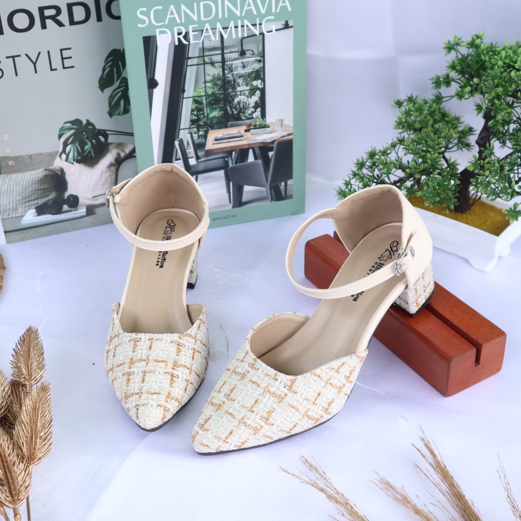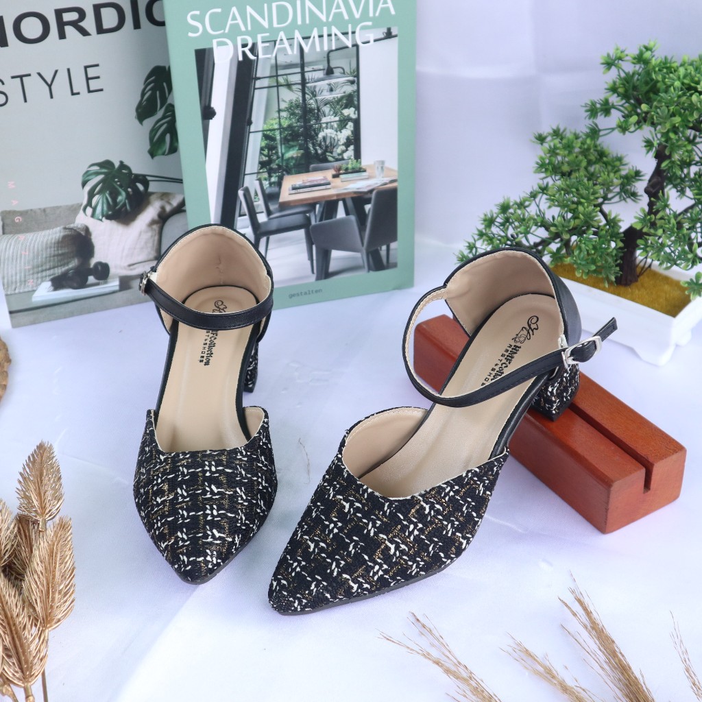 Sepatu Sandal Heels Mules Wanita Kanvas 5Cm