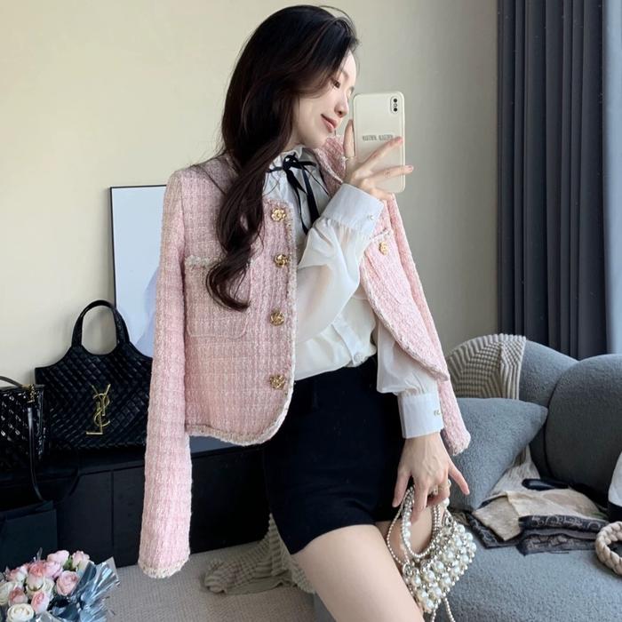 Blazer Pink Lengan Panjang Autumn Outer Crop Import Wanita Korea Atasan Tweed Atasan Wanita Casual Lengan Panjang Cardig