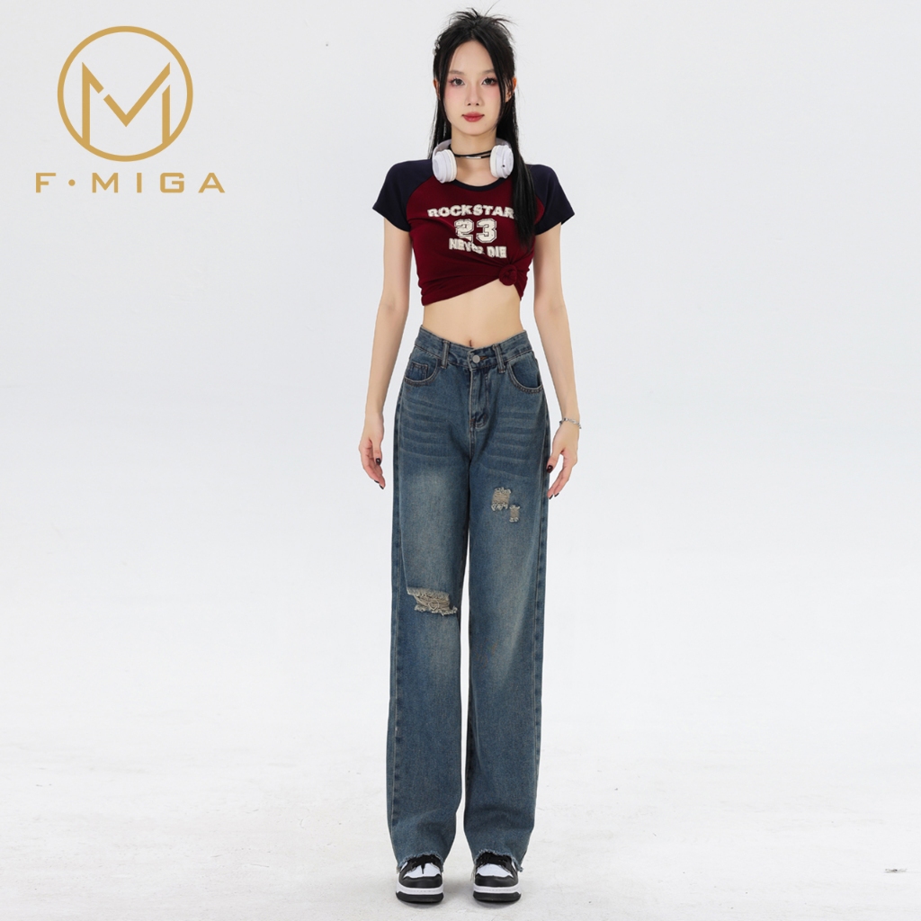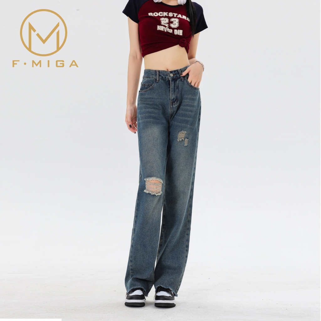 F·MIGA C47 Celana Jeans Wanita High Waist Korean - Biru Retro