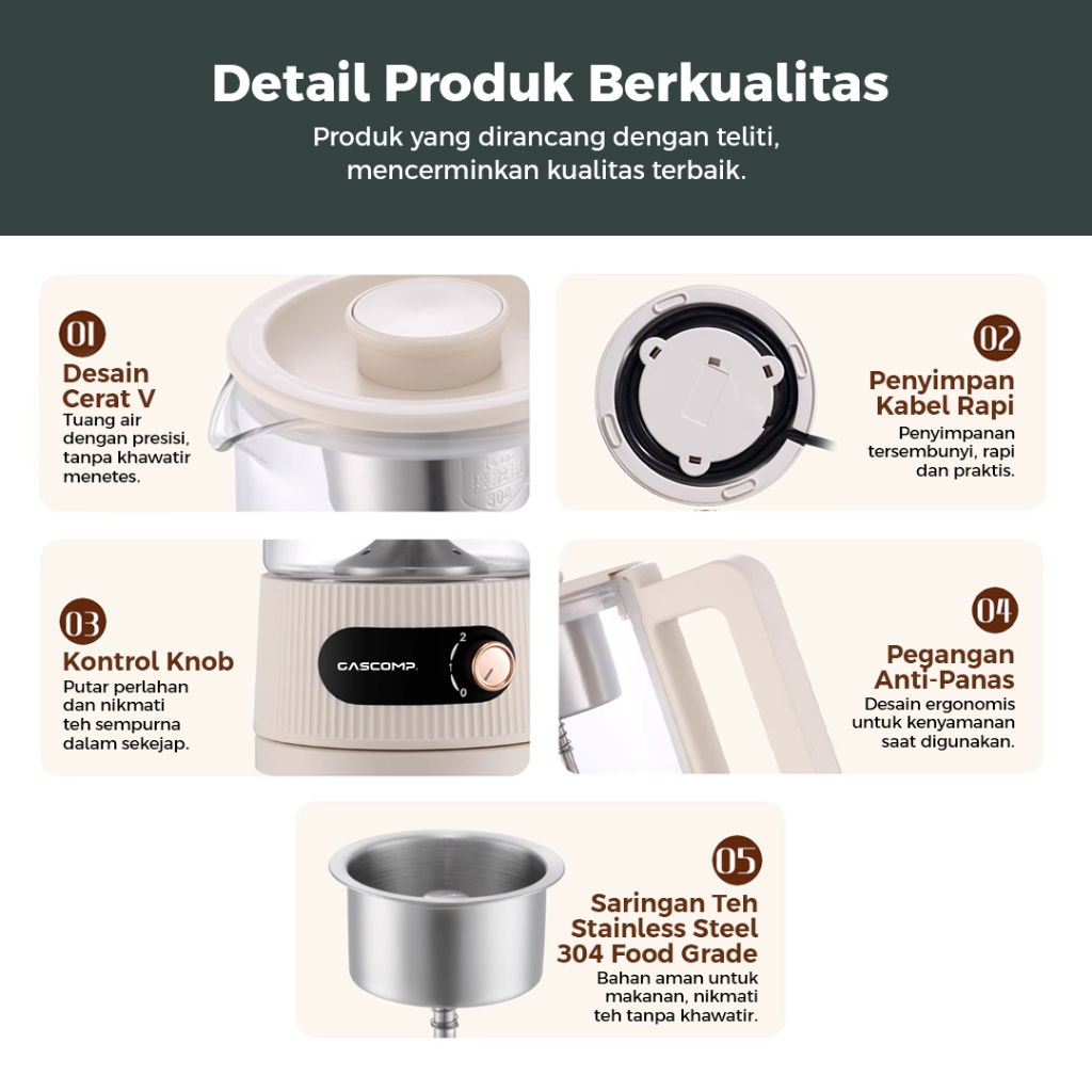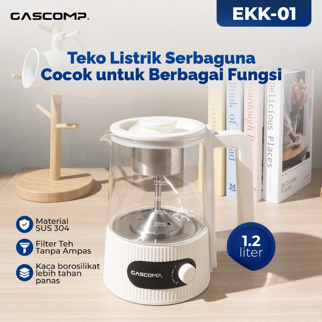 GASCOMP Electric Kettle + Filter EKK-01 GASCOMP Teko Listrik Kaca Food-Grade 1.2L, Bahan Kaca Low Watt 600W, Aman untuk Susu Bayi, Anti Bau & Karat, Teko Listrik Pembuat Teh