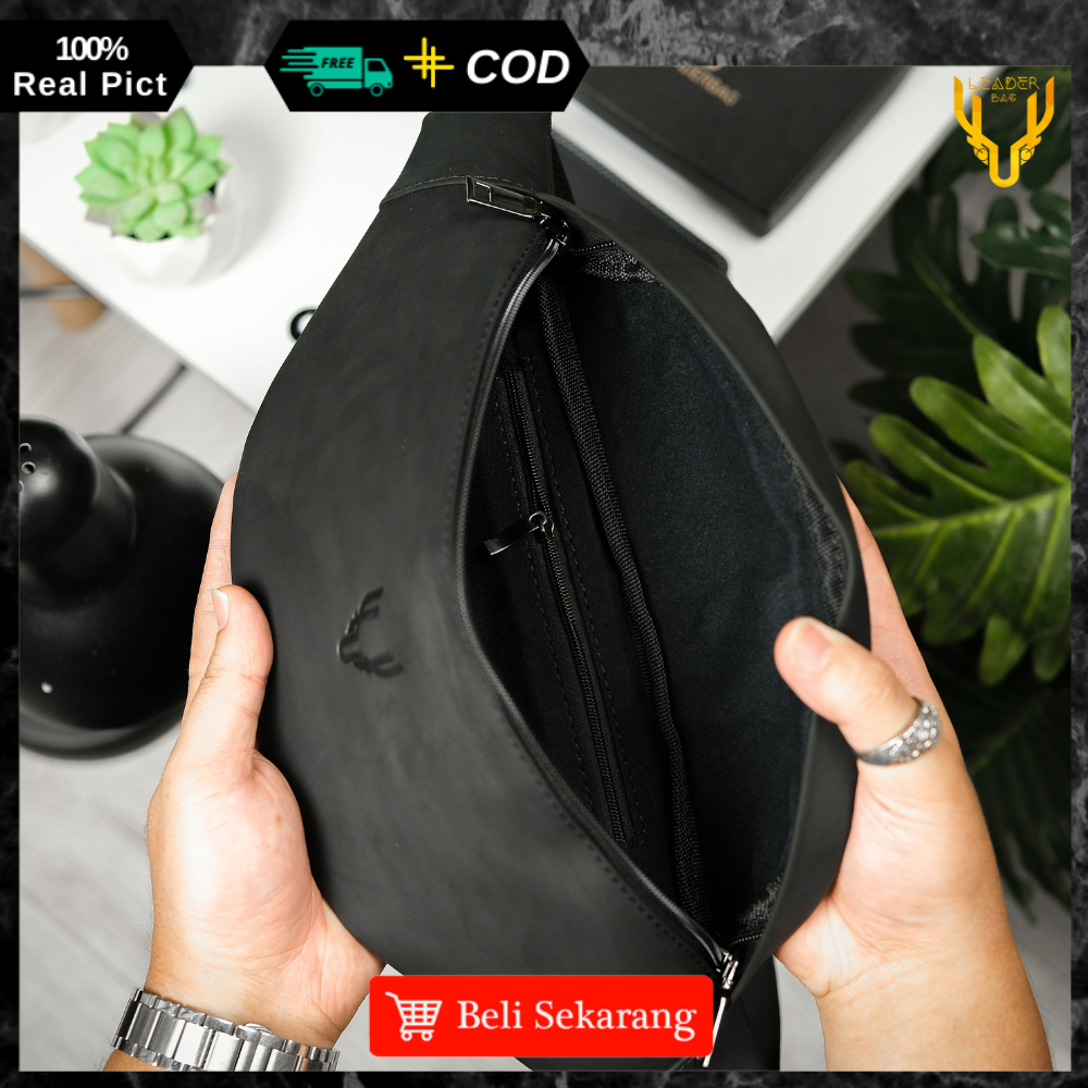 Tas Selempang Pria Kulit Sapi Asli Leaderbag Hitam Waterprof Waistbag Tas Pinggang Cowok Multifungsi