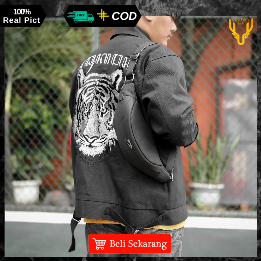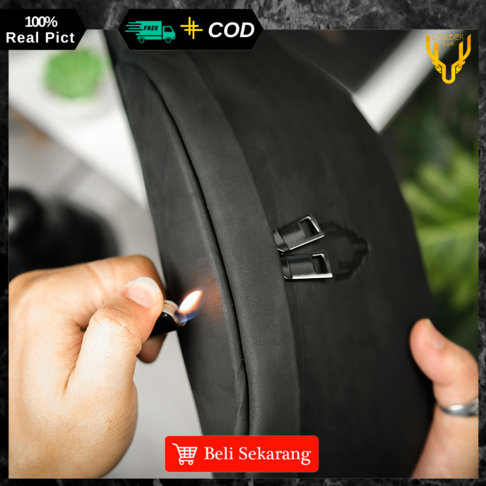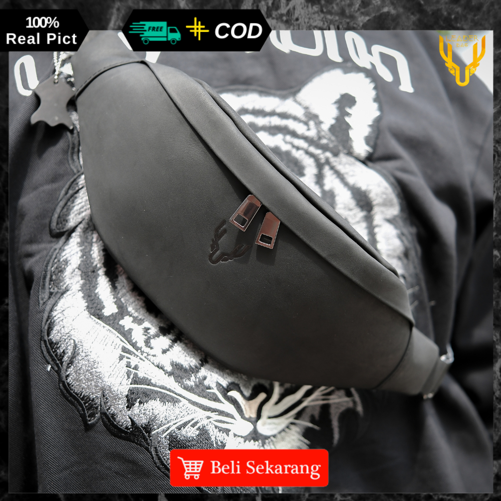 Tas Selempang Pria Kulit Sapi Asli Leaderbag Hitam Waterprof Waistbag Tas Pinggang Cowok Multifungsi