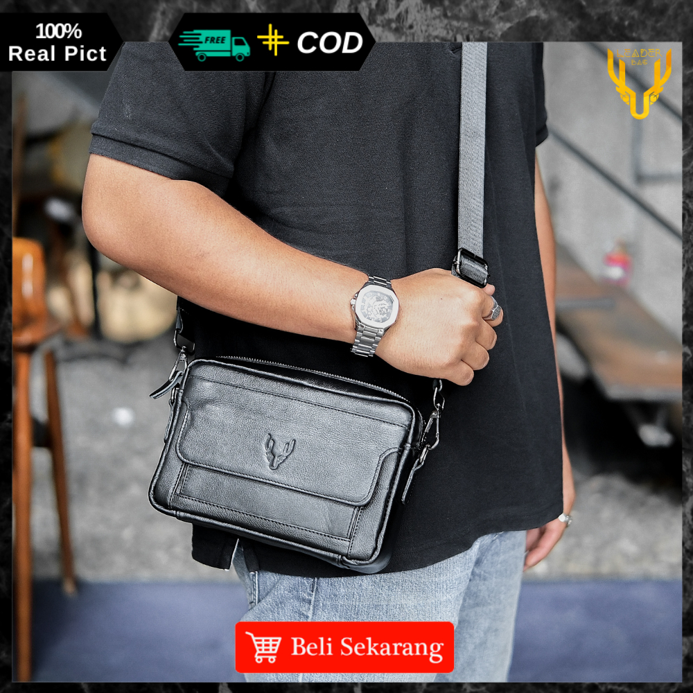 Tas Selempang Pria Kulit Sapi Asli Leaderbag Hitam Premium Handbag 3in1 Waterproof Keren Multifungsi