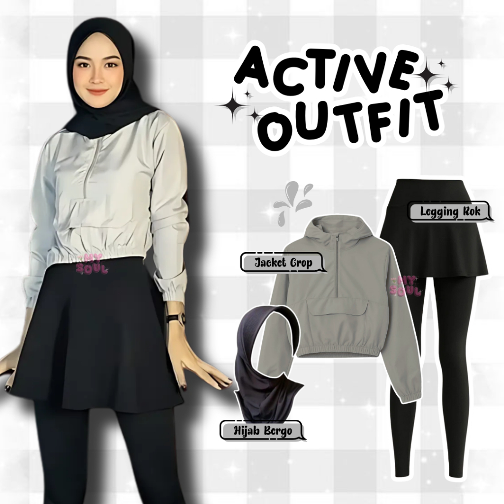 One Set Oalahraga Active (Jacket Crop, Legging Rok, Hijab Bergo) OOTD Outfit Kalcer Sporty MSO40