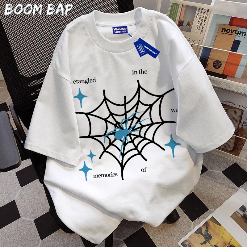 BOOMBAP American retro Style T-shirt Oversize jaring laba-laba Print top| Kaos Wanita Hitam | Kaos pria dan wanita | Street Style 100 PERSENCotton top 10.20