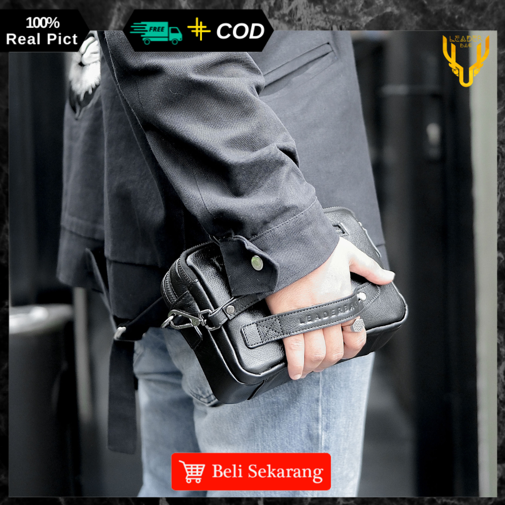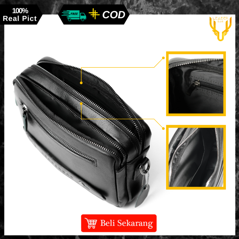 Tas Selempang Pria Kulit Sapi Asli Leaderbag Hitam Premium Handbag 3in1 Waterproof Keren Multifungsi