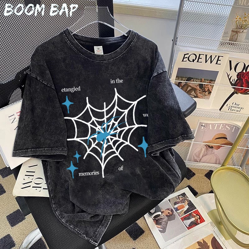 BOOMBAP American retro Style T-shirt Oversize jaring laba-laba Print top| Kaos Wanita Hitam | Kaos pria dan wanita | Street Style 100 PERSENCotton top 10.20