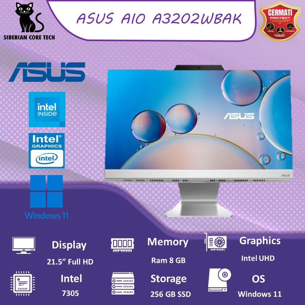 ALL in ONE ASUS PC All in One AIO A3202WBAK INTEL 7305 8GB 256GB W11 berukuran 21.5" FHD