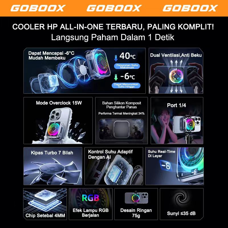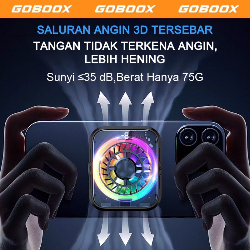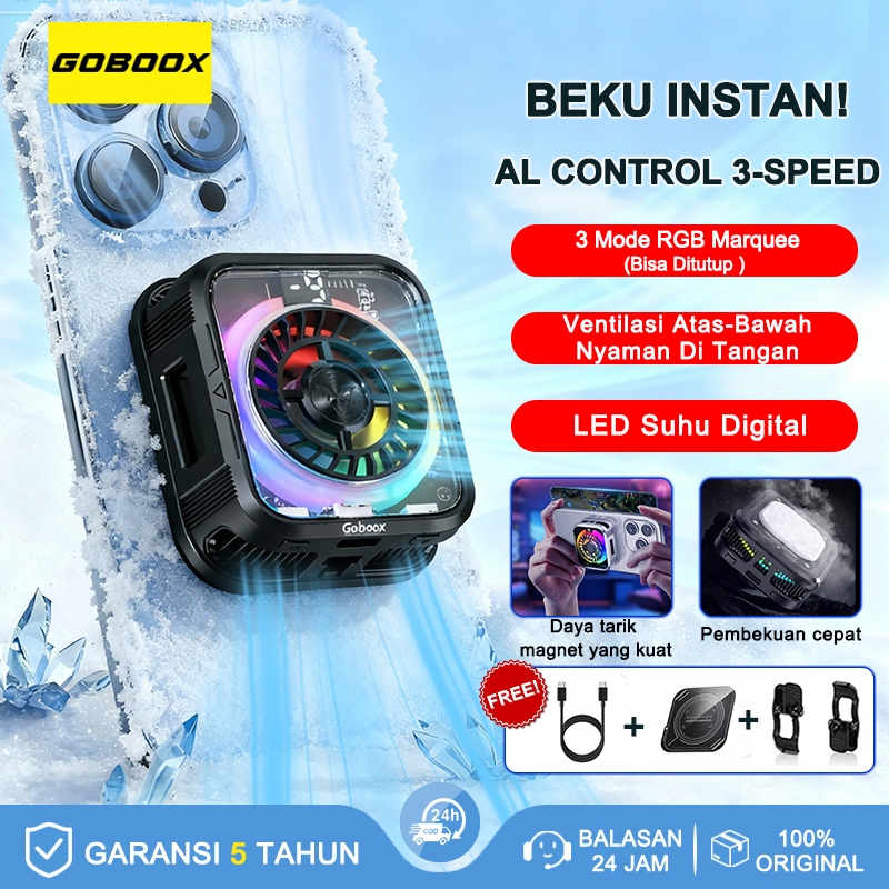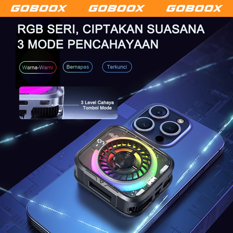 GOBOOX Fan Cooler Hp Gaming Magnetic AI Kontrol Suhu 3-Speed 3 Mode RGB Light 7 Bilah Kipas Pendingin Hp LED Tampilan Digital Hanya 75G Sunyi ≤35 dB (Free 2Clip + Stiker Magnetik1)